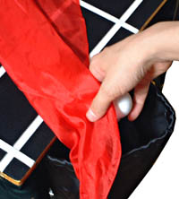 | テーブル上のシルクやステッキを取る動作にまぎれて、手の中に隠し持っている不要な物を密かに処理してしまうことができます。 | ミリオンフラワーや楠玉、その他、密かに手に隠し持つ必要のある物を隠しておき、必要な時に気付かれないように簡単に手に取ることができます。 |
