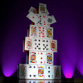 トランプのお城・・・! これを見て喜ばない子どもがいるでしょうか!? 夢溢れるメルヘンチックなこのマジックは、キッズショーでは絶大な効果を発揮します。 【ミリオンカード】、【ファンカード】等のステージカード演技のラストに出現させるにはもちろん最適ですし、特にこれらを演じなくても、あらゆるマジック手順に「トランプのお城」というダイナミックな演出をプラスする事ができます。(しかも極めて簡単にできます。) 出現後は素晴らしいオブジェになりますので、オープニングに出現させて、観客を一気にあなたの世界に引き込むのも良いでしょう。 用具が2セットあれば、左右のアシスタントがそれぞれカードキャッスルを出現させ、真中のあなたは【ペーパーストリーマー】を投げる・・・(または【ファイナルレインボーフラッグ】を出現させる!)なんていう本格的なクライマックスも実現できます。 手順に使用しないショーでは雰囲気を盛り上げるオブジェとして活用できますし、とにかく使える実用アイテムなのです。(^^) |