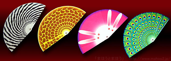「シマウマ」・「キリン」・「うさぎ」・「孔雀」 と動物をモチーフにしたデザインに変化するタイプです。 こちらも主に、子ども向けのマジックショーで大活躍! 色変化も、しっかりと全部別の色合いになるようにしてありますので、例えば 小さな子ども達相手のマジックショーでは、ただ笑顔で扇子を変化させていく・・・ |