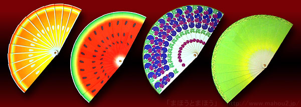 「色変り扇子」というマジック用具は、シンプルに手軽に使えますので、私もよく色々なマジックと組み合わせて使っていました。 そこで 「次は何になるのかな?」 と毎回ワクワクするような扇子ができないか? デザインは徹底的にこだわりました。 四季なんかは、そのまま4種類が当てはまりますが、フルーツや動物などは、多くのモチーフの中から、 フルーツのブドウも、「他の3面と色がかぶらない事」という制約で、それしか選択が無く、「ちょっと無理が無いか?」・・・と、何度もデザインを変更しました。