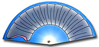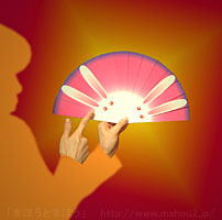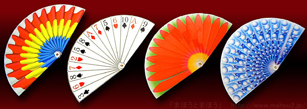 「シルクハンカチ」・「トランプ」・「花」・「水」 をモチーフにしたデザインに変化するタイプです。 これは扇子の色変わりだけを行なう事もできますが、主に演技手順の一部に組み込み、他のマジックと面白い連携がとれるように。・・・と企画したものです。 4種類のデザインは、どれもマジックショーでよく登場する品物です。 さらに、マジックとマジックの間をスムーズにつなぐ役割にも使えます。 独自の演技を構築したいマジシャンには、最も創作意欲をかきたてられるタイプ・・・ではないでしょうか? |