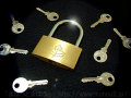 南京錠が1つ、それと鍵がたくさんあります。 南京錠を開けることができる鍵は1つだけで 他の鍵では南京錠が開かない事を |