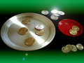 | ◆手に握った銅貨が銀貨に変化! | ◆コインが消えてトレイの下から現れる! |
