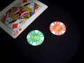 2枚のポーカーチップを見せ、相手の手の平に乗せます。 あなたは一組のトランプから1枚のカードを抜き出します。 そのカードでポーカーチップを軽く叩くと、一枚が500円玉に変化してしまいます! 500円玉、チップ、そしてカードも調べてもらいますが何も怪しい所はありません・・・