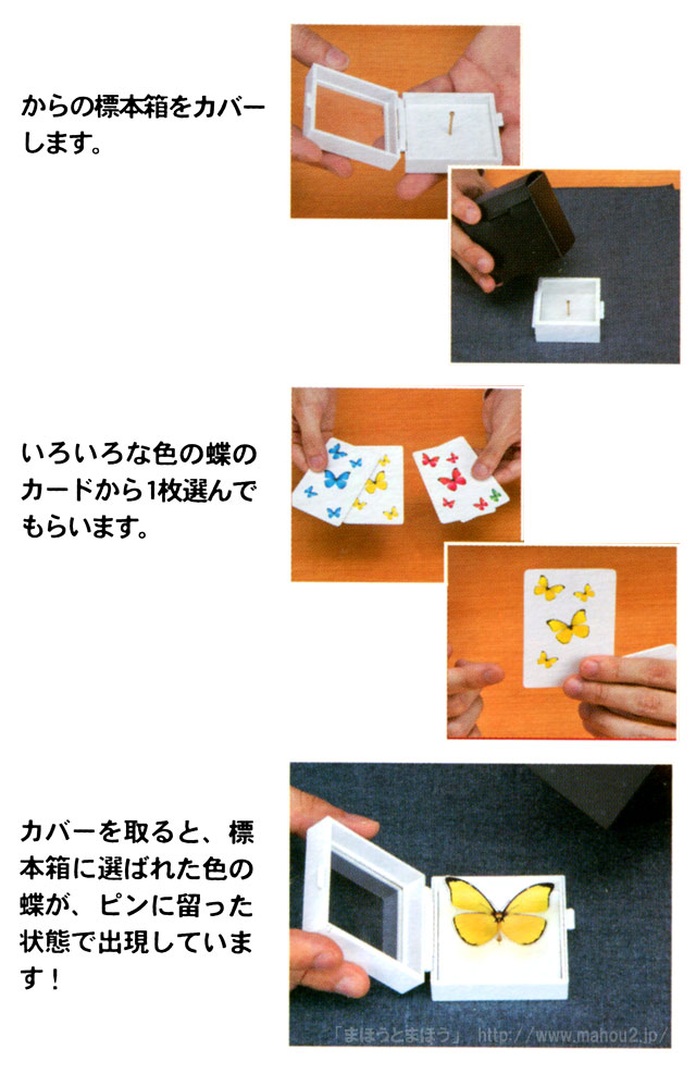 このマジックは「空っぽの標本箱の中に相手の自由に選んだ色の蝶がピン留めされて出現する」という、テーブルマジックにしては華やかでダイナミックなものです。