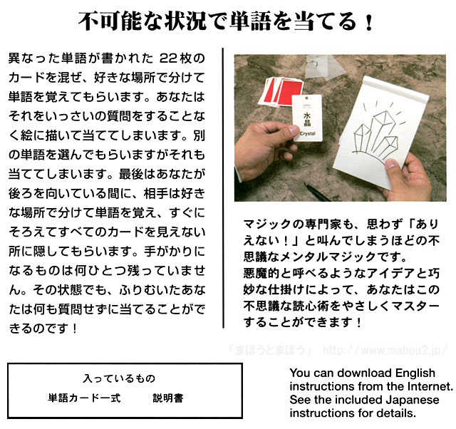単語カードを使った読心術のマジック。 自分しか知らないはずの事をズバリと言い当てられるのはマジックでは定番中の定番ですが、当てられた瞬間はドキッとする飽きのこない現象です。 このマジックでは単語帳カードの中から1つを相手に覚えてもらい、それをマジシャンが当てるのですが、よくある普通の当て方で2度当てた後、さらにもっと不可能なやり方にして、それでも見事当ててしまいます。 相手からすればあなたがどうやって当てているのか全く分からず、「本当に心を読んでいるとしか思えない!」と感じます。 何しろ本当に手がかりが全くないのです。 説明書を読んだ時点では 「そんなに上手くいくのかな?」 と思われるかもしれませんが大丈夫。 マジックの・・・特にメンタルマジックの面白さ、奥深さが味わえる。そんな用具です。 |