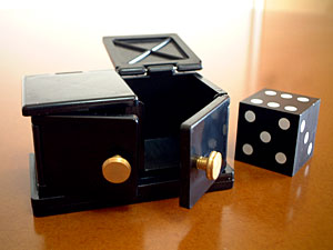 ミニチュア戸棚のようなボックスとサイコロが1つあります。