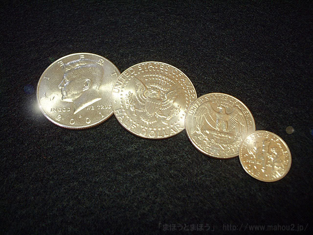 芸術的な精密加工が施されたトリックコイン。テクニック不要で誰でも簡単にできます。 (演技後、コインは相手に手渡して調べさせる事もできます。)