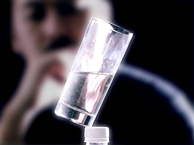 液体の入ったグラスが、あり得ない斜めの状態で立ちます・・・